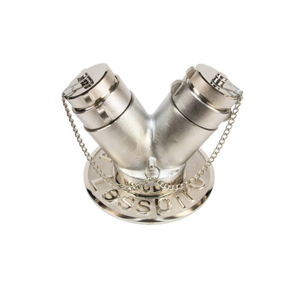 La toma siamesa de Lespiro está fabricada en bronce forjado con un acabado pulido, con acople a presión para mangueras de hidrante. Con dos conexiones de entrada de 2½” en cuerda NST (NH) y conexión de salida recta de 4” en cuerda NPT, con capacidad para un gasto de 500 G.P.M. Además, la toma siamesa cuenta con válvula antirretorno en cada entrada que permiten agregar líneas adicionales sin interrumpir el flujo. Incluye anillos giratorios, juego de tapones de 2½” en cuerda NST y disco con leyenda de “Bomberos”.
